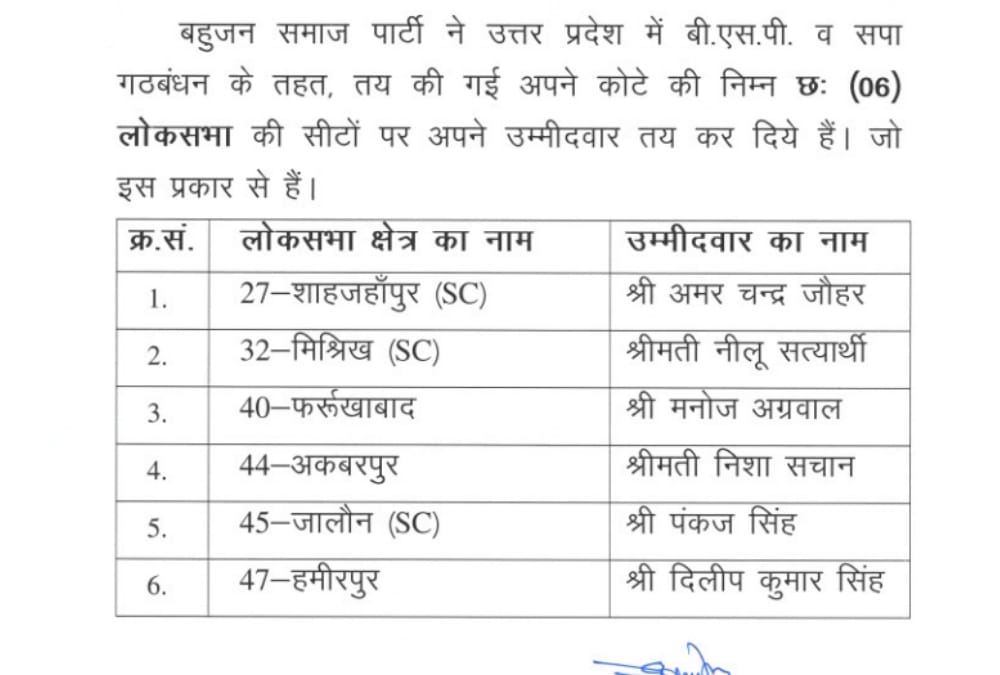 BSP ने जारी की उम्मीदवारों की दूसरी सूची, घोषित किए छह उम्मीदवार